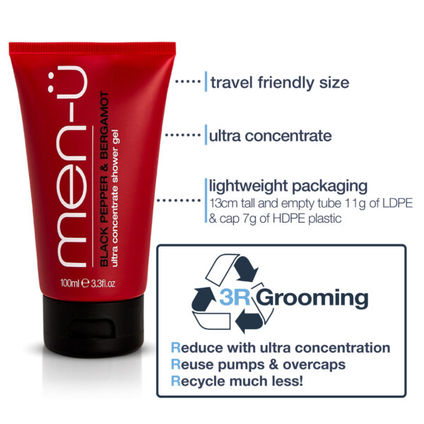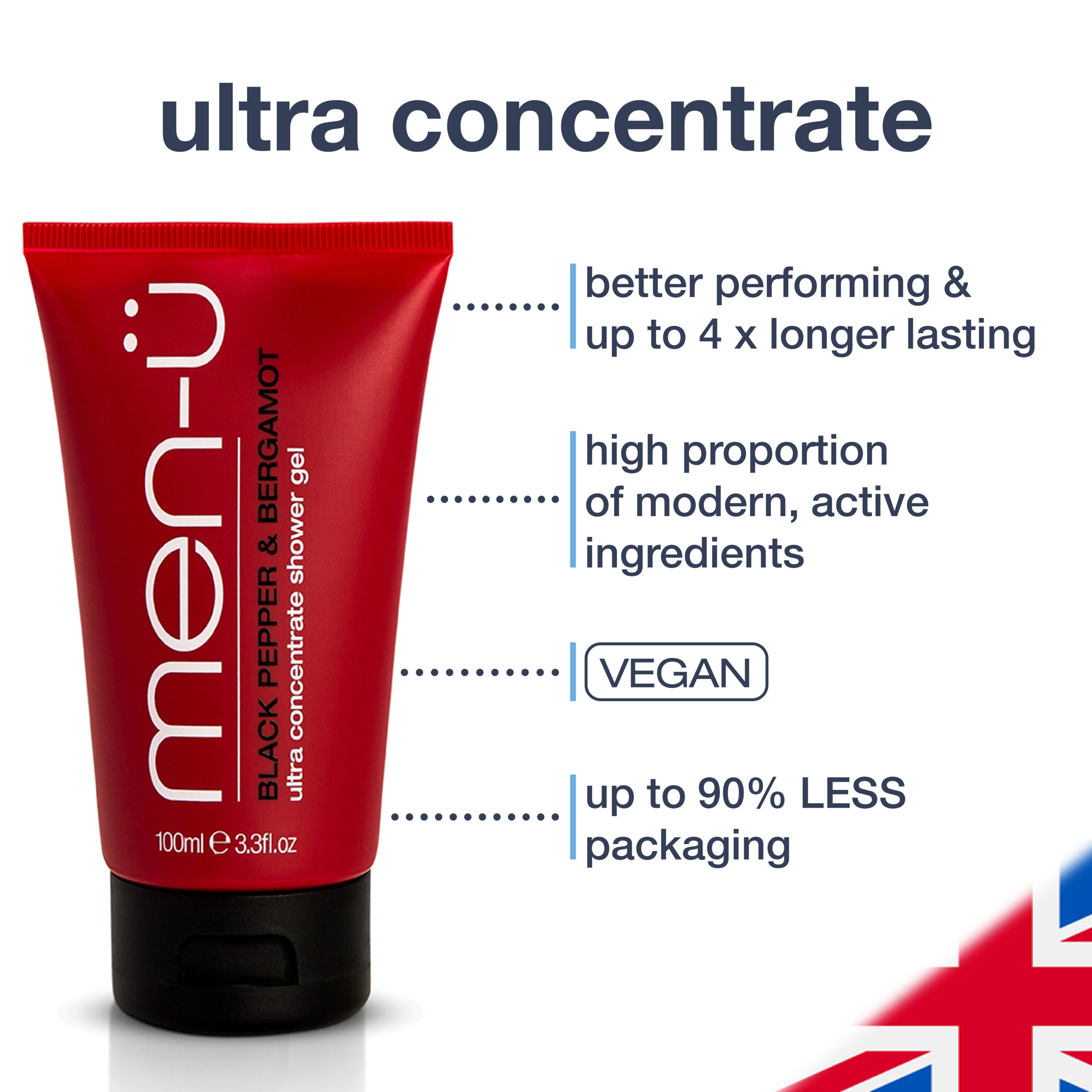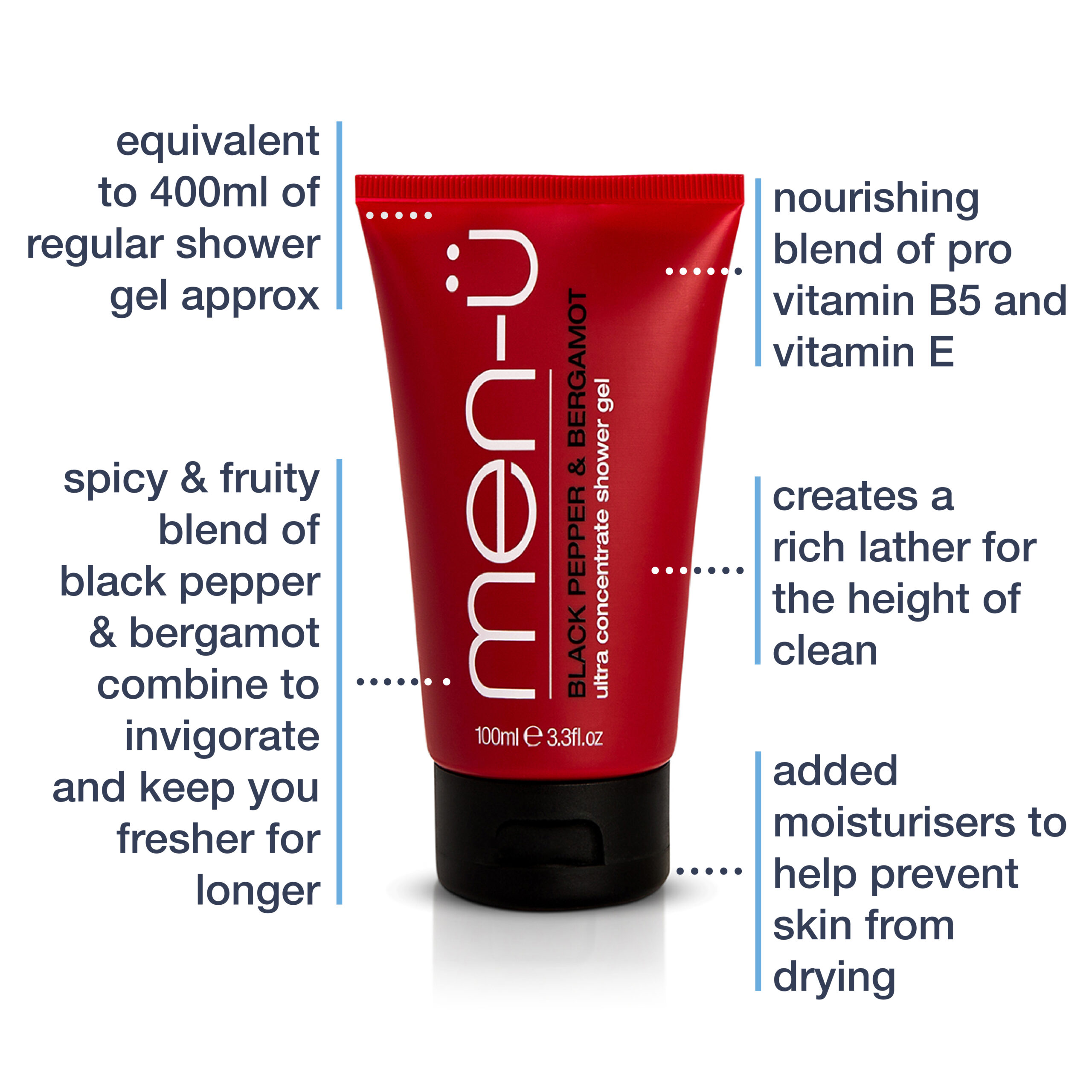 If showering is your main hygiene and personal care regime for the body (often twice a day), why would you not want this to be an efficacious and enjoyable experience? men-ü ultra concentrate shower gels have a high percentage of active ingredients so a little goes a long way. Unlike most cheaper shower gels, men-ü does not disappear through your fingers and creates a rich lather for the height of ‘clean’ and has added moisturisers to help prevent the skin from drying. Includes Pro Vitamin B5 and Vitamin E. This spicy and fruity blend of black pepper and bergamot citrus combine to invigorate and keep you fresher for longer.