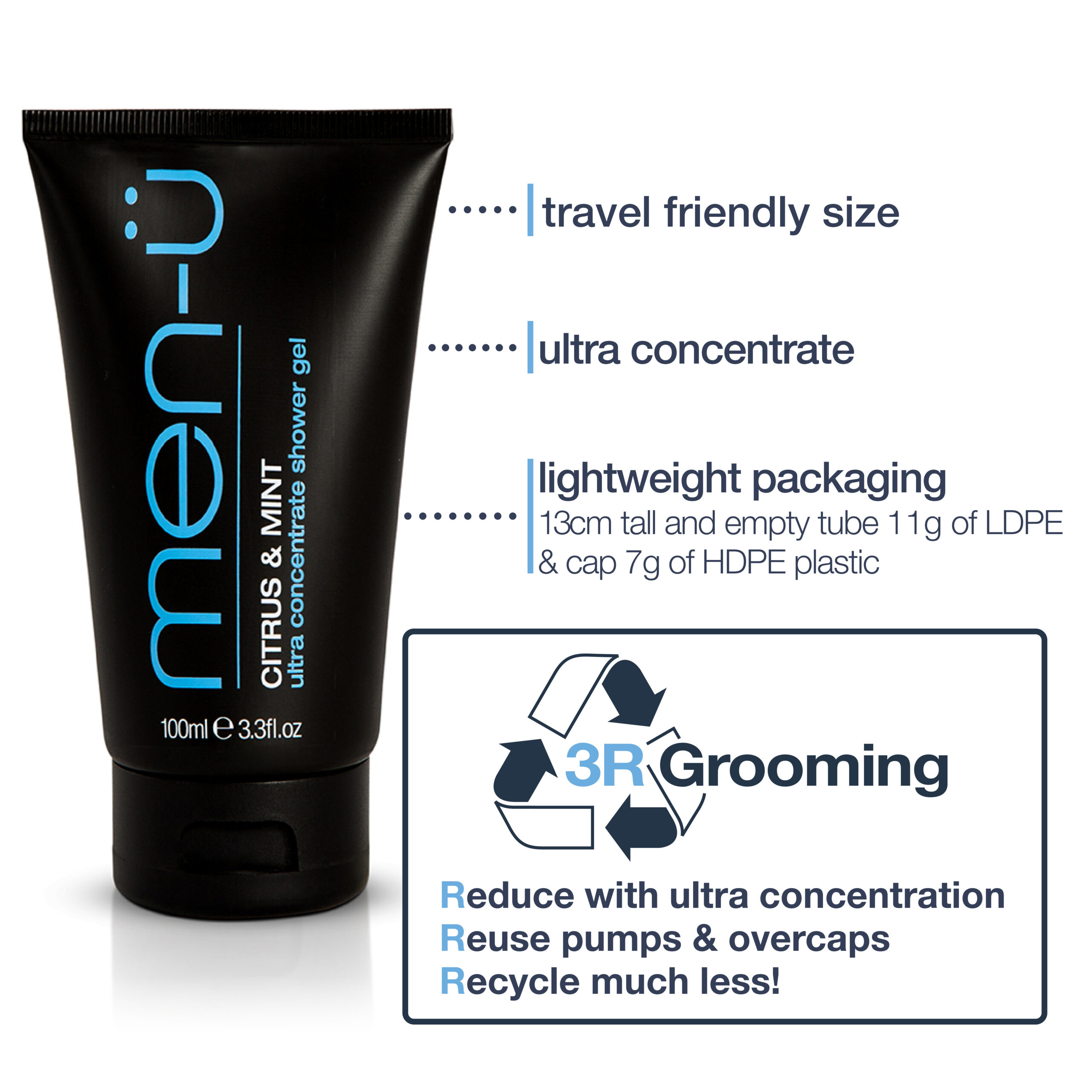Reduce with ultra concentration, Reuse pumps & over caps, Recycle much less! For more information on 3R Grooming & refills click here.