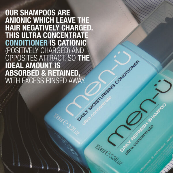 Designed to work in harmony with men-ü shampoos (Daily Refresh and Healthy Hair & Scalp), which are anionic and leave hair negatively charged, this conditioner is cationic—positively charged to attract and lock in just the right amount of hydration. Any excess simply rinses away, preventing build-up and heaviness.