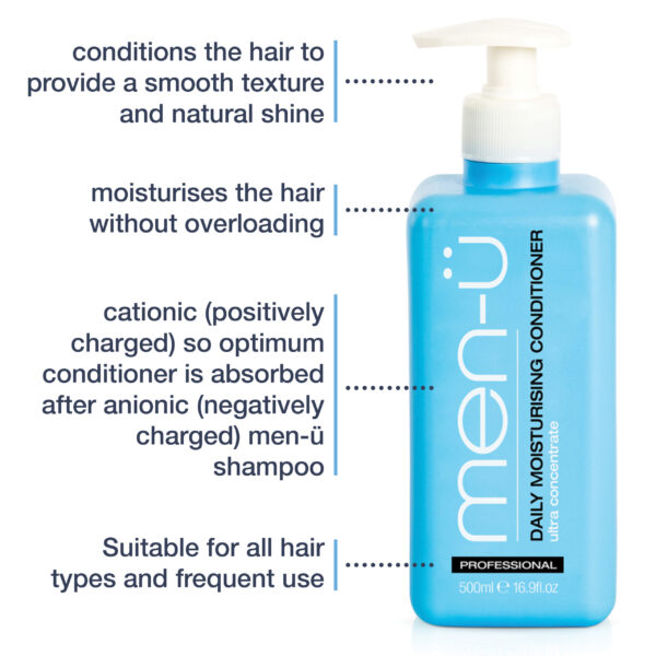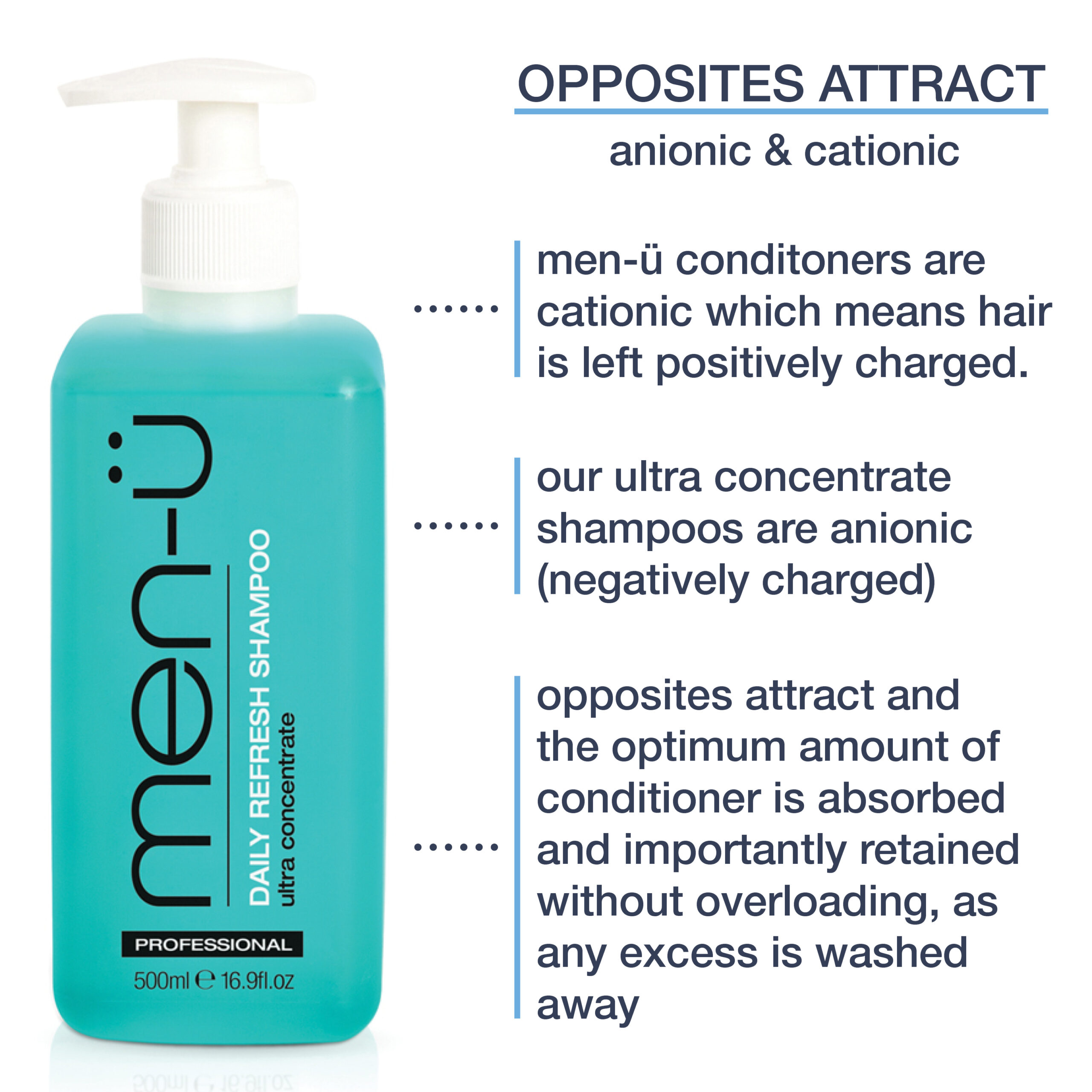 Designed to work in harmony with men-ü shampoos (Daily Refresh and Healthy Hair & Scalp), which are anionic and leave hair negatively charged, this conditioner is cationic—positively charged to attract and lock in just the right amount of hydration. Any excess simply rinses away, preventing build-up and heaviness.