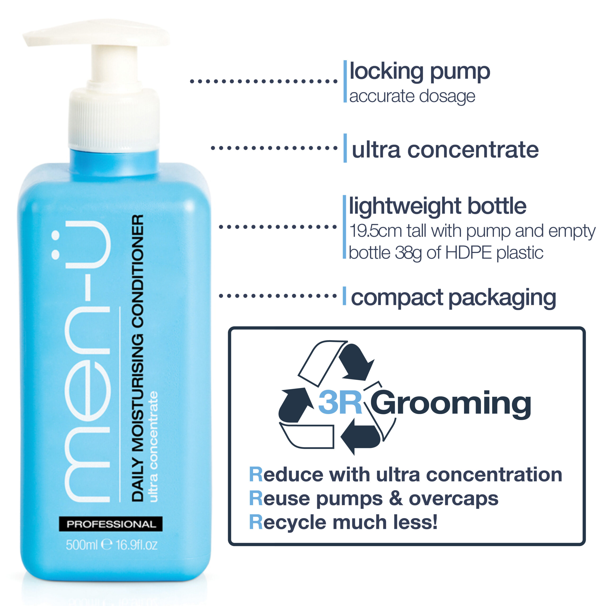Reduce with ultra concentration, Reuse pumps & over caps, Recycle much less! For more information on 3R Grooming & refills click here.