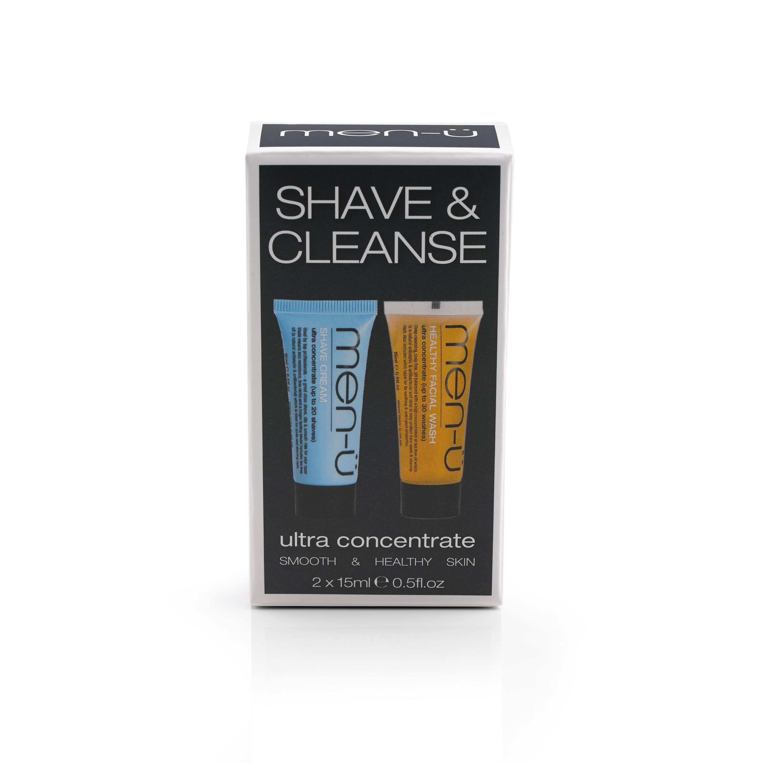 Shave & Cleanse – Shaving is a first step to healthy skin, with exfoliation a woman can only dream of, as well as a smooth surface. men-ü ultra concentrate Shave Cream is packed with lubricants, including silicone and moisturisers that help to provide optimum slip, without drying the skin. Many foams and gels generate too aerated a lather. Only what is in contact with the skin and beard matters, all else is wasted! Deep cleansing after shaving is paramount to removing dirt, oil, cream, loose/dead skin cells and hair, which can all contribute to blocked pores.
