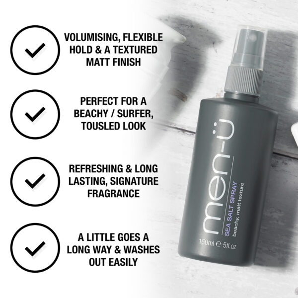 Achieve that beachy, surfer look with men-ü Sea Salt Spray – designed to create volume and texture with a flexible hold & a natural, matt finish. Perfect for casual, laid-back styles with added lift & movement.