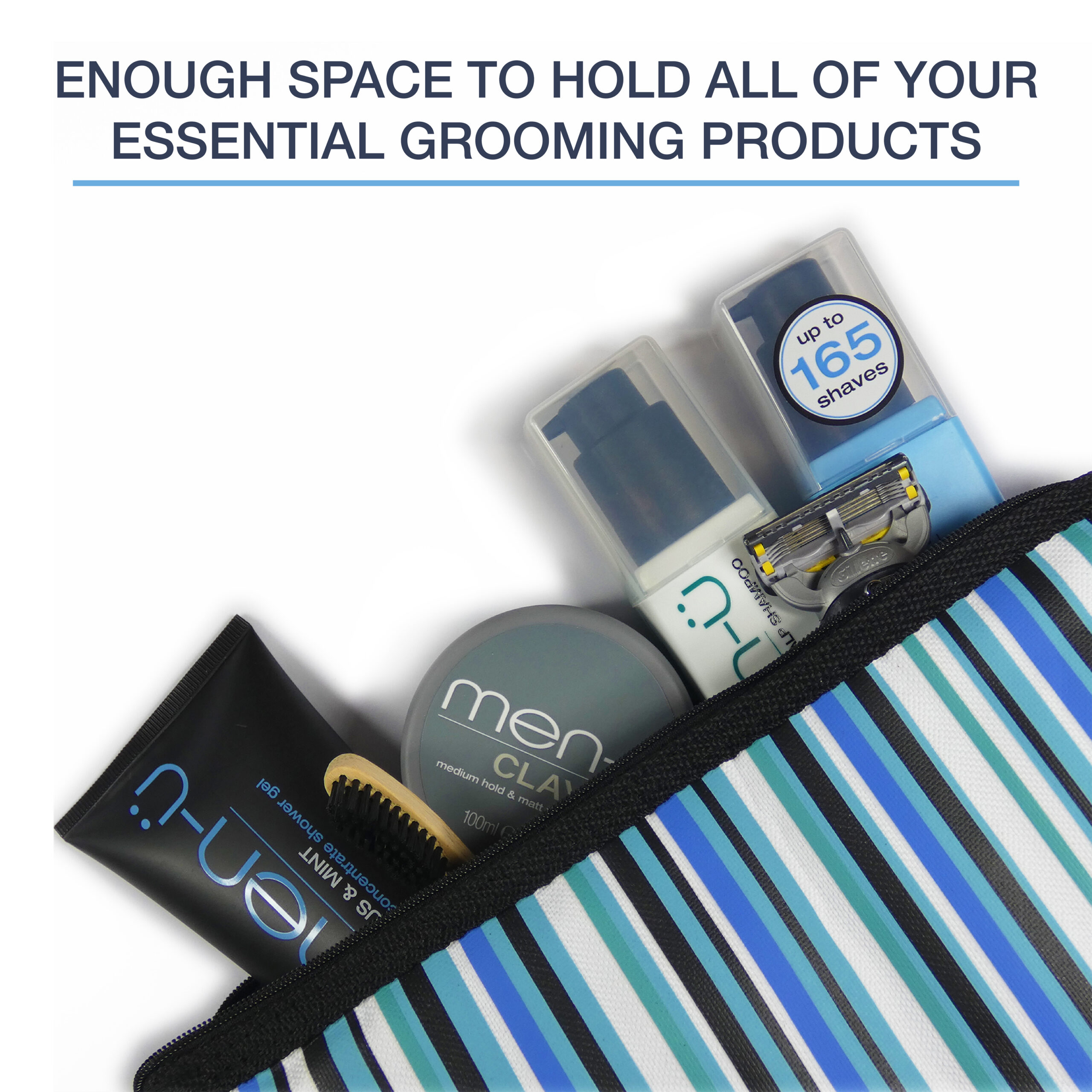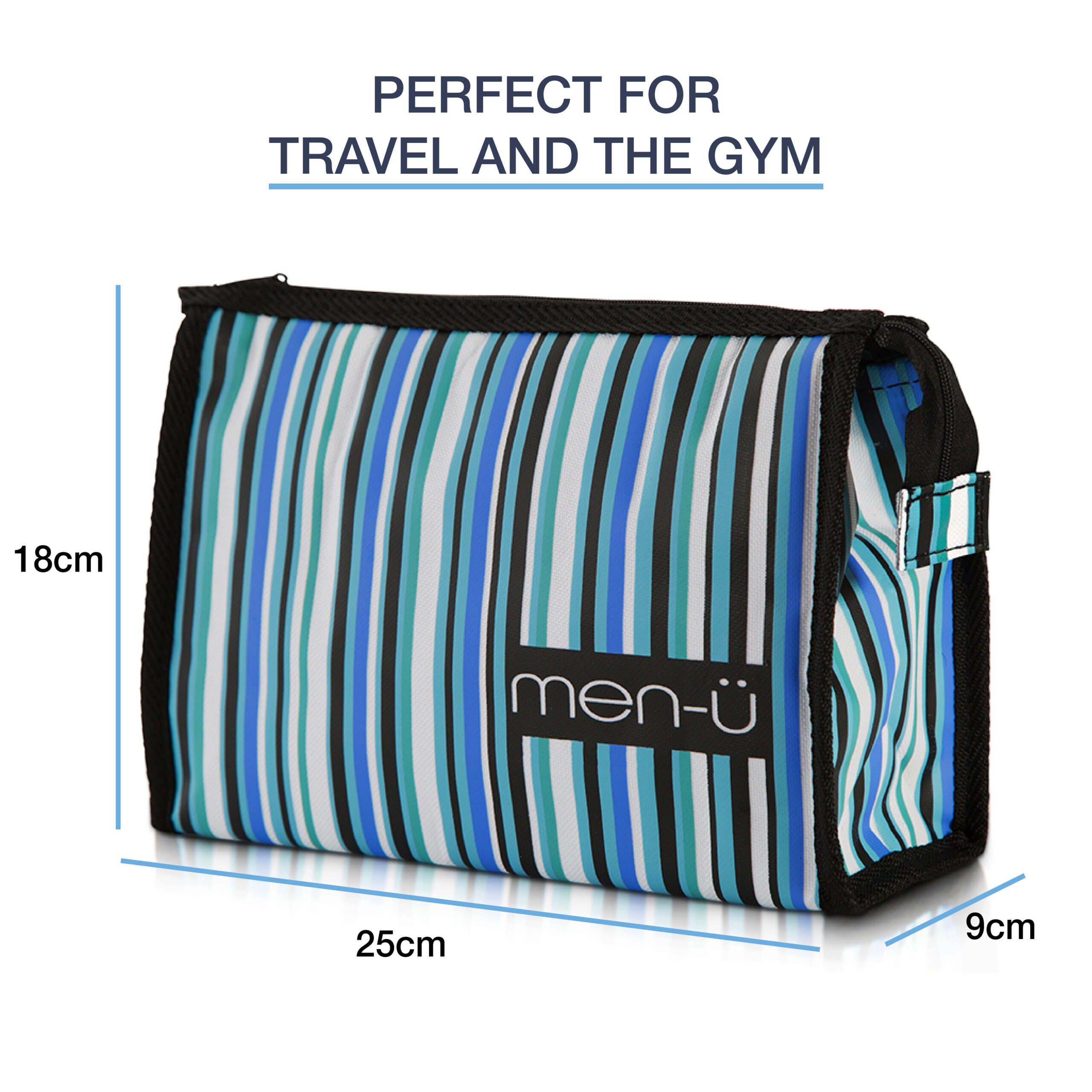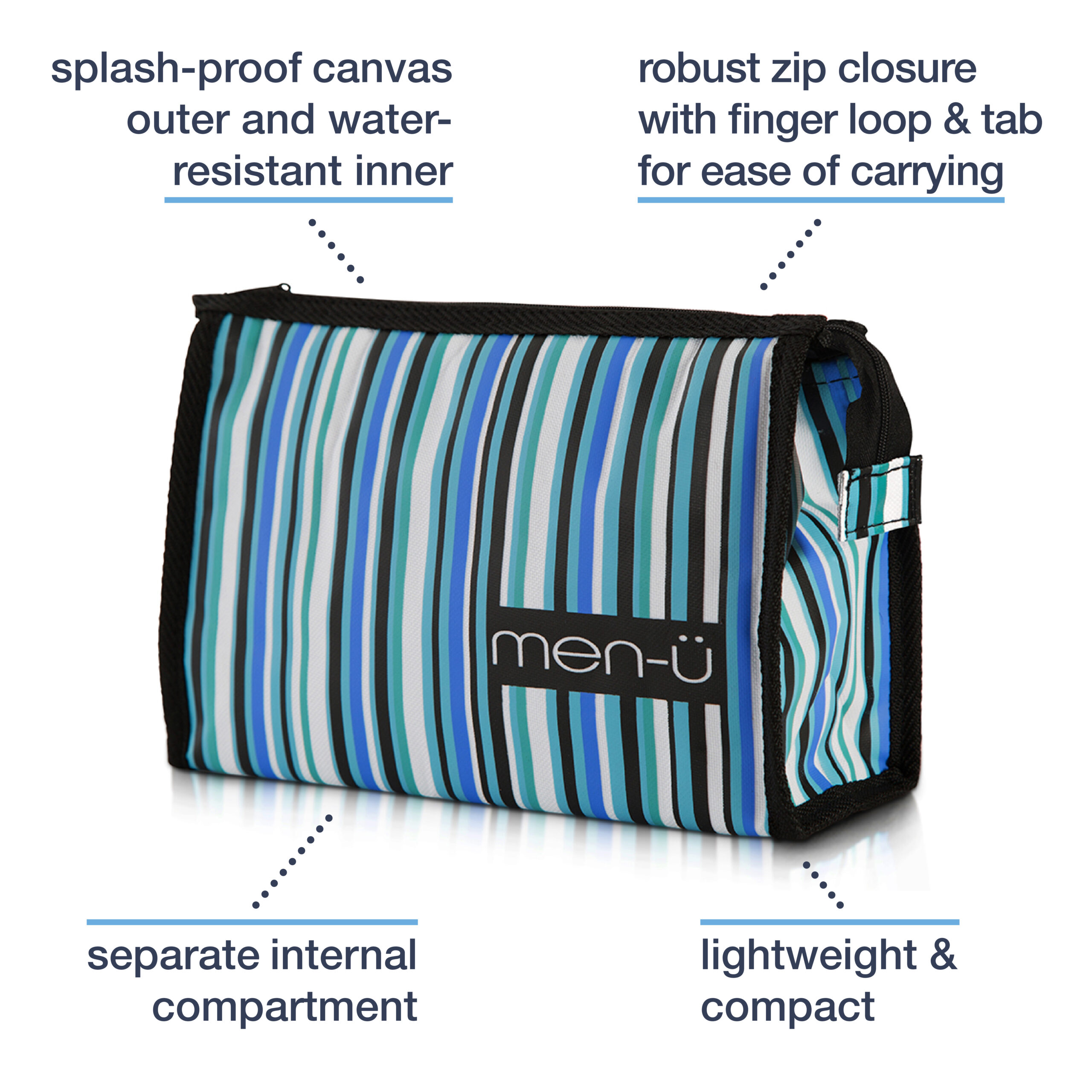 This lightweight and compact toiletry bag is great for the bathroom, sport and travel with enough space to hold all of your essential grooming products. Features a robust zip closure with finger loop and tab for ease of carrying. Splash-proof canvas outer and water-resistant inner with a separate internal compartment for your razor and toothbrush. Finished in a modern and stylish Black, White, Green and Blue stripes design with black trim.